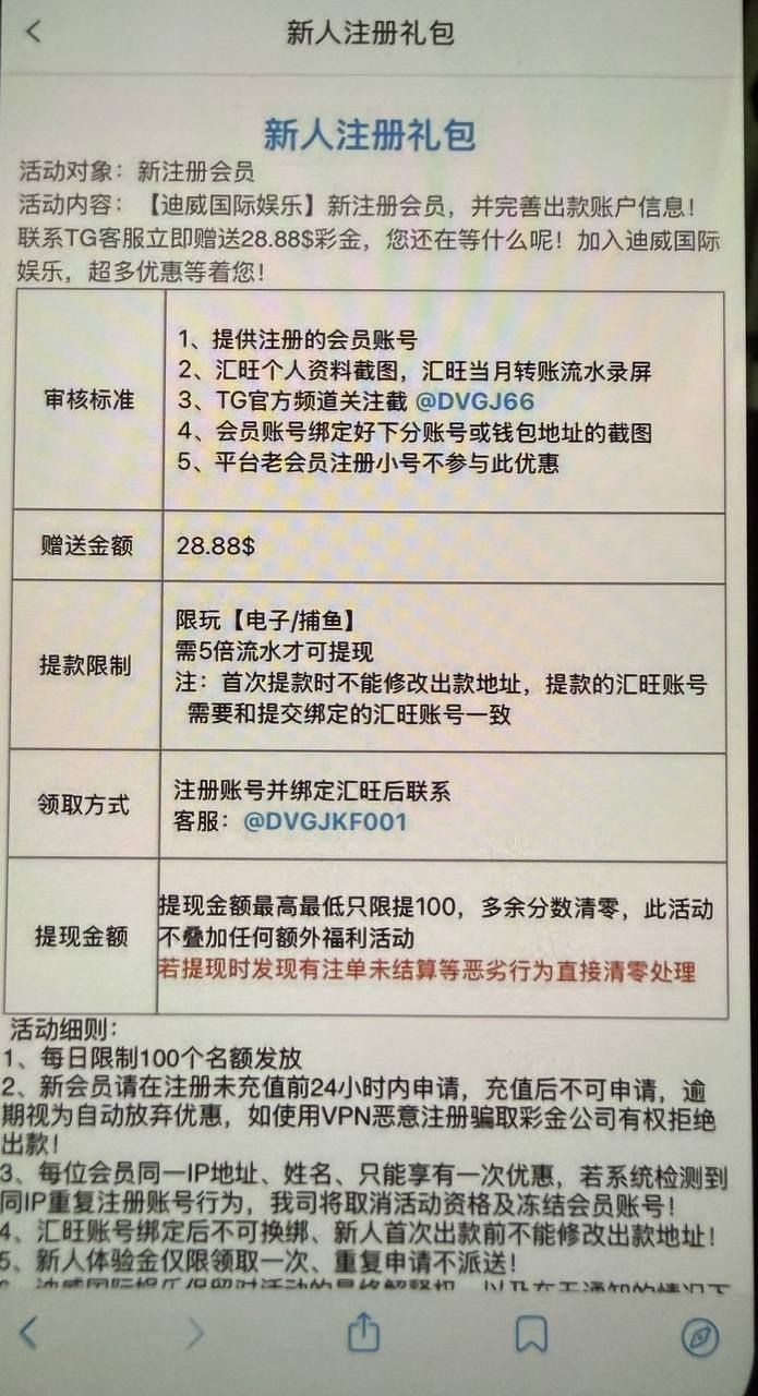 活动:新人注册送28.88u找飞机客服领取每日名额有限  要看汇旺地址流水  限制电子捕鱼 最高最低100u